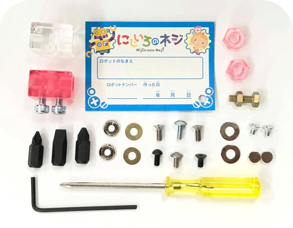 東大阪を中心とした企業の製品と技術で作つくられた、にじいろのネジで大人気のワークショップ「ロボットキャラクターを作ろう」専用キットです。