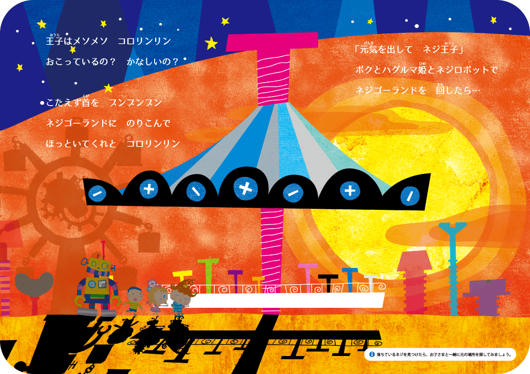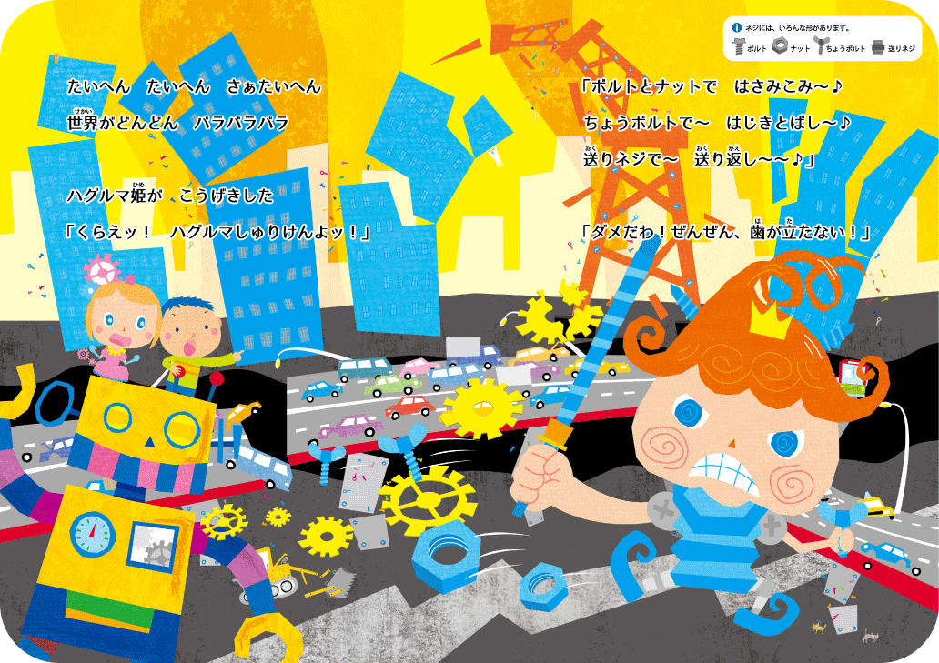 ぐるっと周りを見回して、ネジがどこにいるかをさがしてみましょう。 絵本と一緒にお使い頂くと、より楽しくコミュニケーションが図れます。